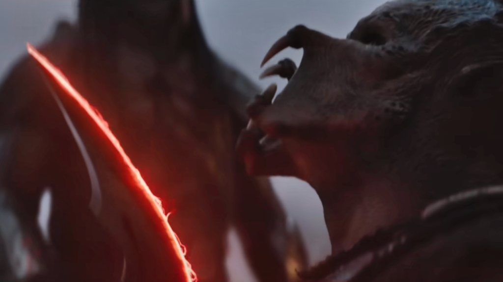 There’s a desolate desert planet in the distance. A Predator drives a hover ship (like the cycles seen in Killer of Killers). It’s revealed that Dek, the lead Predator character, is piloting it. He uses an energy grappling hook to get up to a cave where it becomes clear what he’s looking for: his brother, Kwei. They have a prolonged sword fight, jumping around on the pieces of the cave, and having an extended discussion about honor. Kwei gets the upper hand on Dek and seemingly sends him falling to his doom. However, Dek catches himself and climbs back up, where it’s revealed that his brother has a clear fondness for him that he can’t always show. The pair leaves the cave and goes to Kwei’s ship. They have a bonding moment over something from their childhood: Dek used a toy to save Kwei and broke his tusk in the process, but Kwei kept the toy to remember.