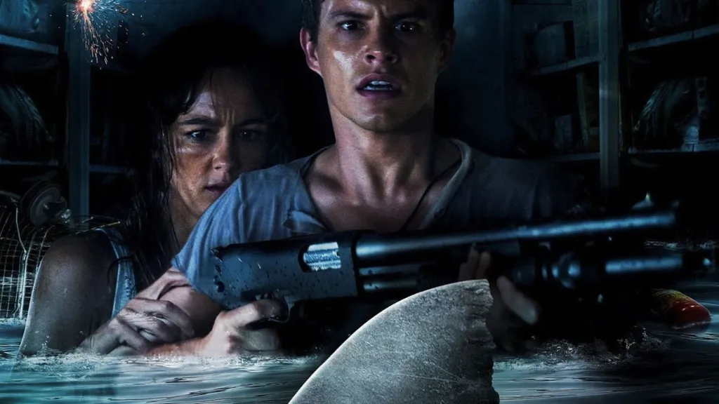 Bait is an Australian shark flick that takes place almost entirely in a supermarket. We follow Josh, a former lifeguard who watched his friend (and brother to his fiancรฉ, Tina) get gobbled up by a great white. Now, a year later, a tsunami has hit, and Josh, Tina (who is now his former fiancรฉ but is in the store with her new boyfriend), other supermarket staff, a young couple, and a pair of robbers (one of whom is played by the late Julian McMahon), are stuck within these walls with a 12 ft great white swimming between the aisles.