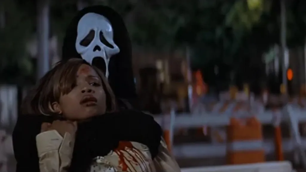 Scream 2, however, is a bit more crowded a movie, but it breezes by in a more traditional way. The first act consists of the initial pair of murders, introduction of new characters, and reuniting with the first film’s surviving characters. The second act is primarily focused on Gale and Dewey’s investigation. Then the third, of course, is the Ghostface reveal. And, while there’s more plot in the sequel, it never feels overstuffed. Well, save for one scene, which feels like what it is: the product of a rewrite leading into a finale that was also the product of a rewrite.