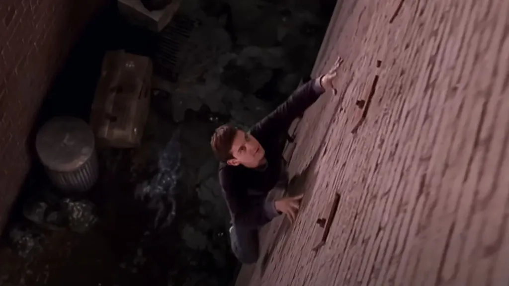After Peter Parker has discovered his new powers following the bite from a radioactive spider, he decides to take them on a test drive around New York City. One of the powers he tries out is that of crawling up a brick wall in an empty alley.