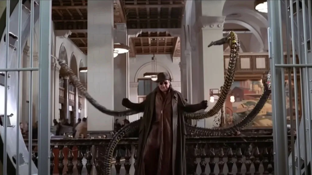 Spider-Man 2 has a memorable scene in which Doctor Octopus enters the same bank that Peter Parker and Aunt May just happen to be in. Doc Ock rips the massive metal door from the bank’s vault and steals numerous large bags of money, leading to a slam-bang fight scene with Spider-Man.