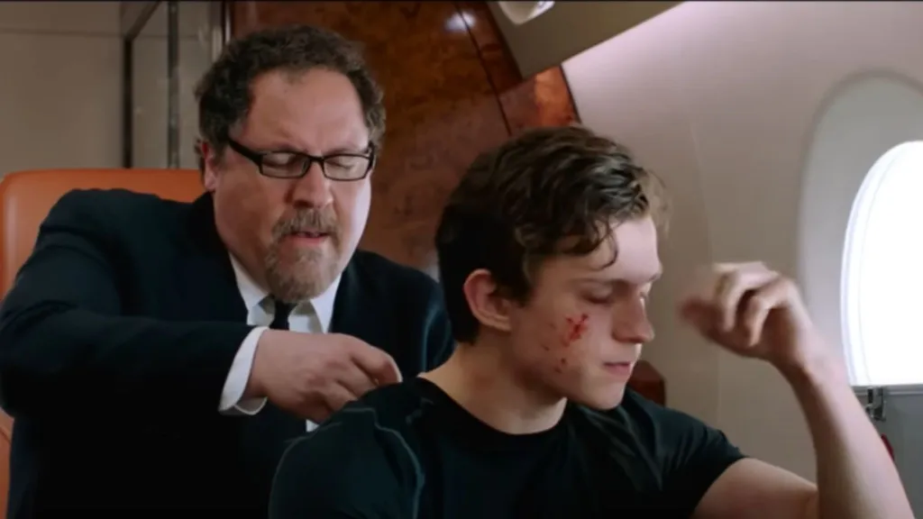 During this scene, Happy is stitching up a cut on Peter’s back. However, unless he’s using some Stark Industries-patented invisible suture material and needle, it’s clear that Happy is just pretending to stitch up Peter. Kudos to Jon Favreau for his fine acting job, though.