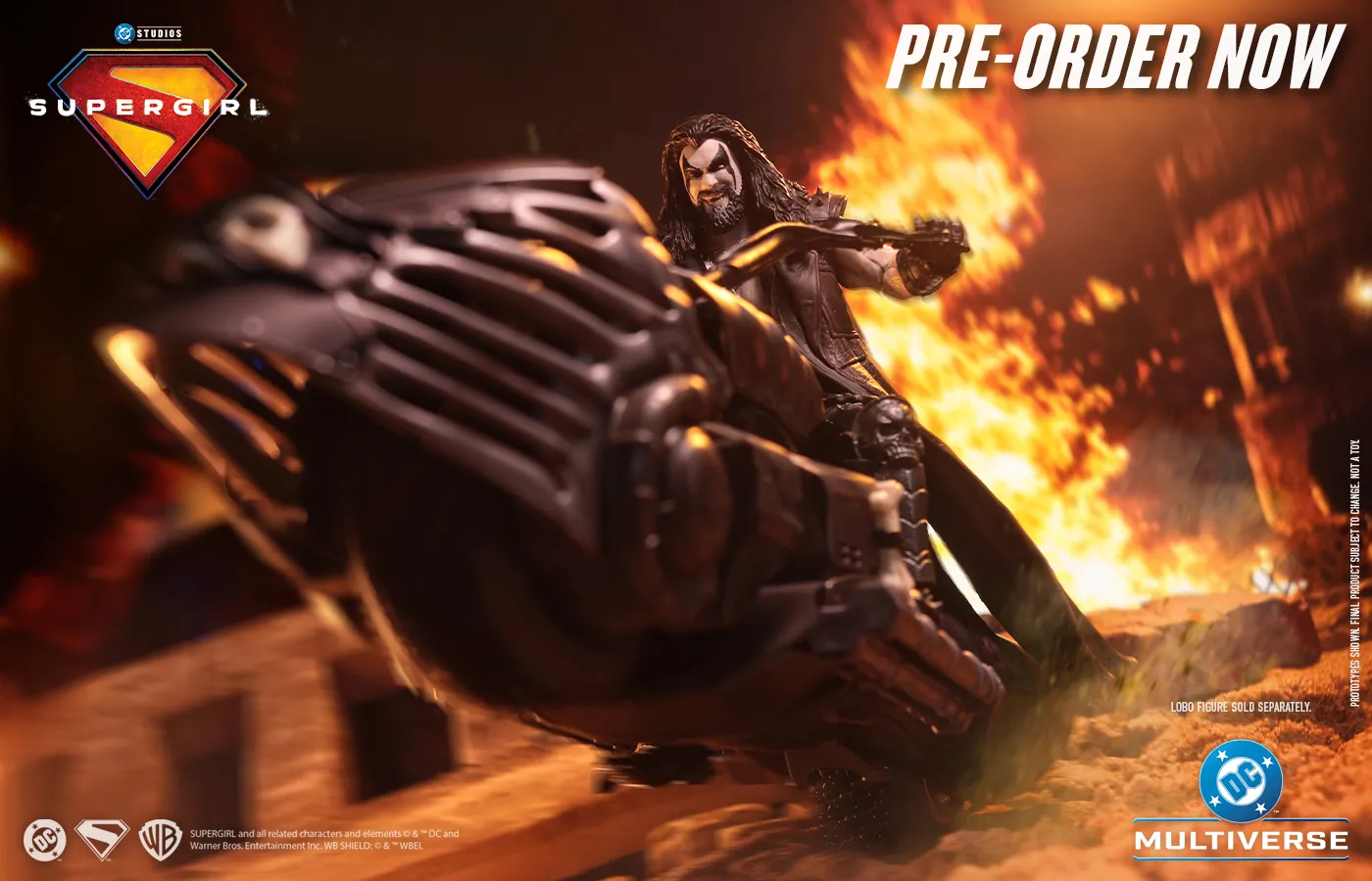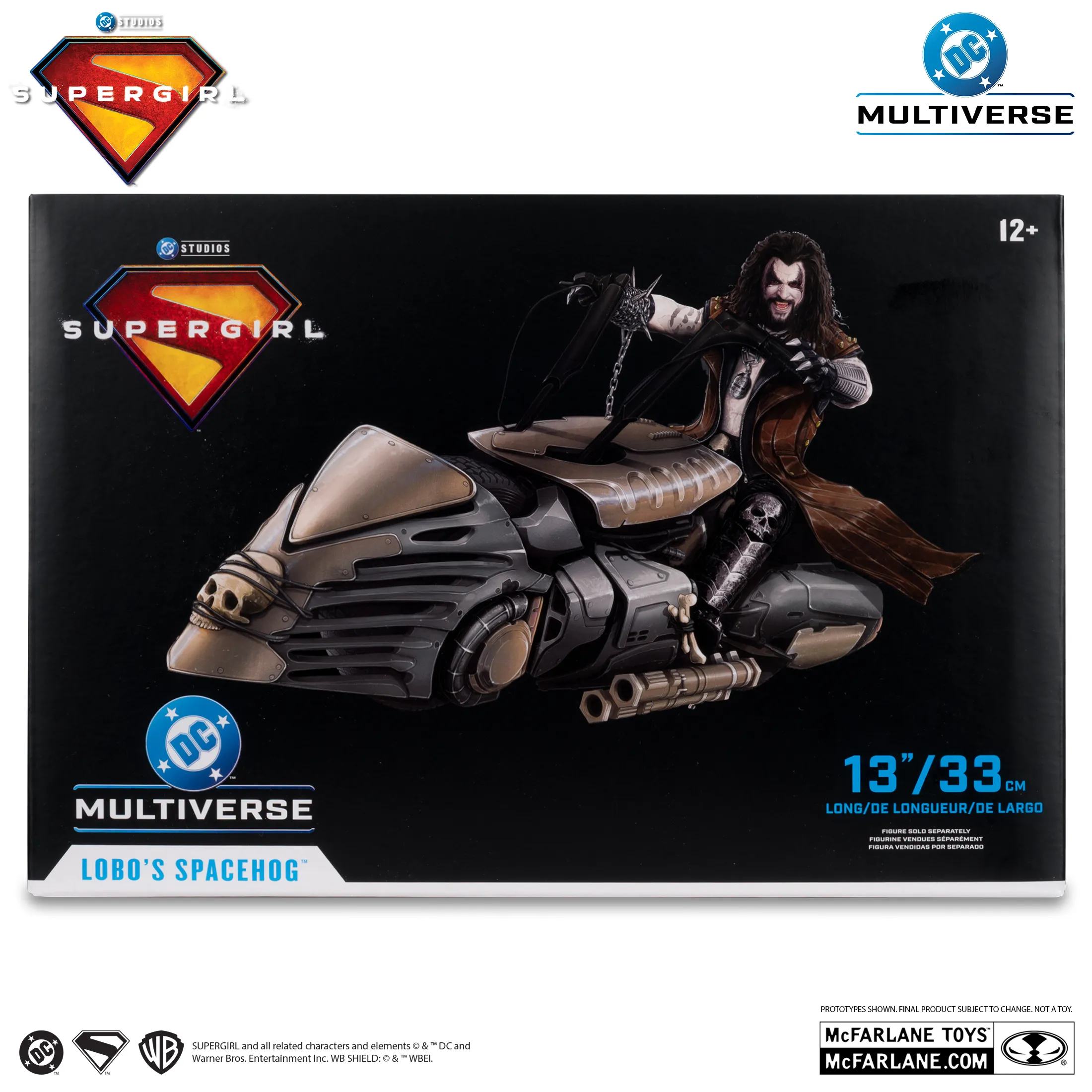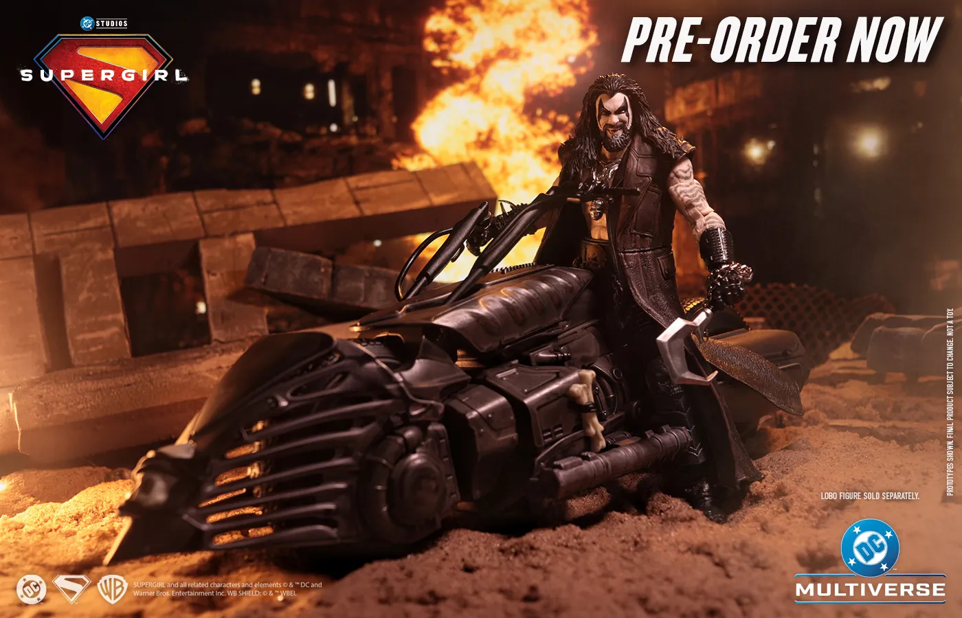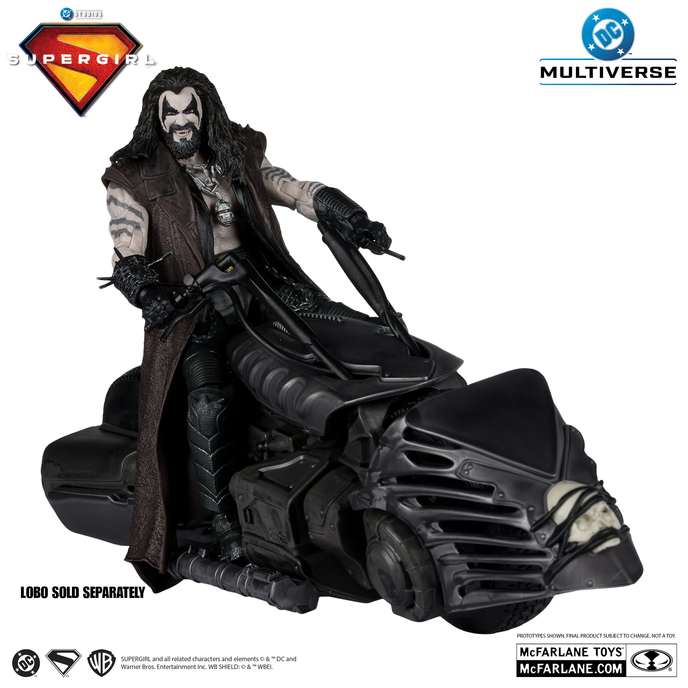 McFarlane’s DC Multiverse toyline still has some aces up its sleeve this year, and that includes Lobo’s Spacehog from the Supergirl movie. As you can see in the video spotlight below, the new design is looking pretty slick. The new bike features one bigger wheel on the back and a small wheel up front, as well as a pointed grill piece at the front with a skull strapped to it, which is a trademark of Lobo’s bikes from the comics. The top features a rising plate with the two long handlebars stretching upwards, and the two trademark rocket engines are on either side of the back wheel. You can check it out up close in the video below.