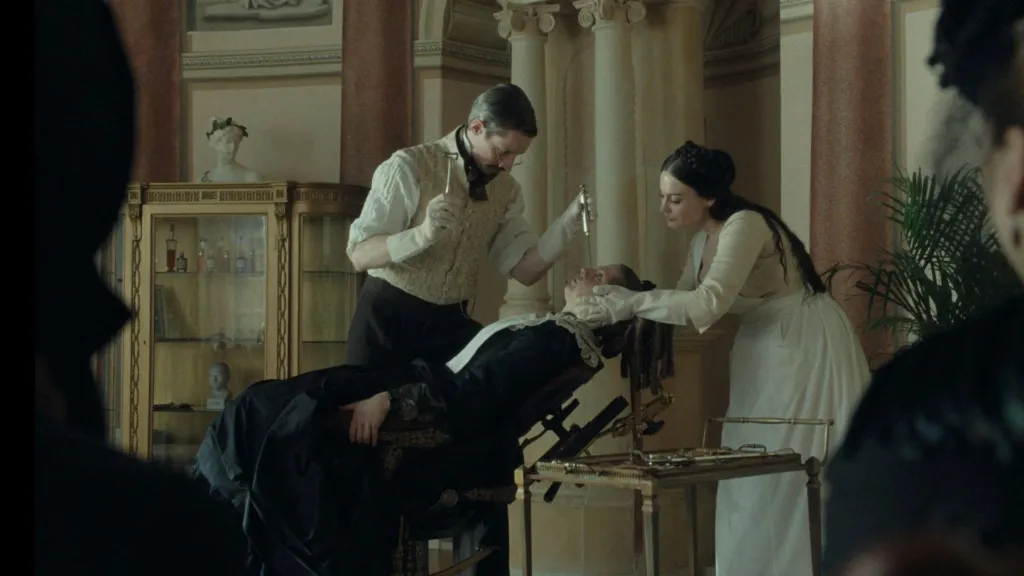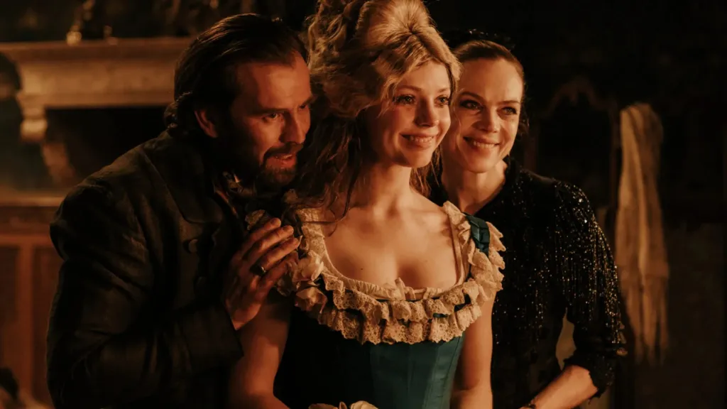 With The Ugly Stepsister, Blichfeldt crafts a Cinderella story filtered through the lens of Cronenbergian body horror, turning every act of beauty transformation into something monstrous. The film’s most nauseatingly unforgettable moments never feature gore for gore’s sake. They’re loaded with commentary on the absurd, damaging lengths society pushes people toward in pursuit of perfection. The performances are a big part of why it works. Myren, playing the titular and quintessential ugly stepsister, Elvira, shows the aching vulnerability beneath the character’s growing madness, and the rest of the cast match her beat for beat. Every sneer from the stepmother feels like it could cut flesh. Every glance from Prince Julian (Isac Calmroth) carries the weight of judgment disguised as charm. The costumes and set design lull you into thinking you’re watching a traditional period drama, but the longer you stay, the more everything rots at the edges. Silk turns to stained fabric, candlelit halls start to feel suffocating, and the camera lingers just a little too long on things you wish you hadn’t noticed.