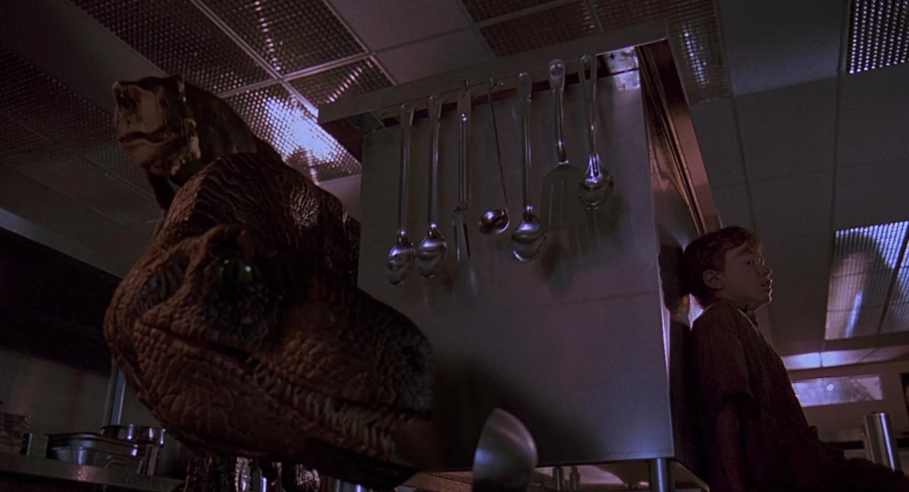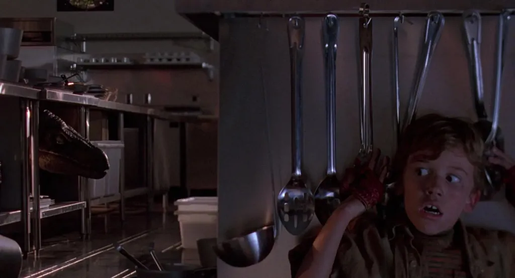This scene takes place near the end of Jurassic Park, after the island’s dinosaurs are accidentally released due to a “malfunction” in the park’s security systems. After escaping their paddock, the voracious Velociraptors pursue and trap young brother and sister Tim and Lex in the main kitchen in the Visitor’s Center. It’s cleverly designed to be a high-tech facility and is outfitted with advanced appliances that complement the scene’s atmosphere, as Spielberg uses the environment to heighten anxiety. The stainless steel and shiny surfaces create a cold, sterile setting to contrast the inevitable mess. Every nook and cranny appears to be a potential hiding place, emphasizing the kids’ vulnerability. The pair who were once safe in the park’s control, are suddenly alone and exposed with no weapons, no plan, and no means of escape.
