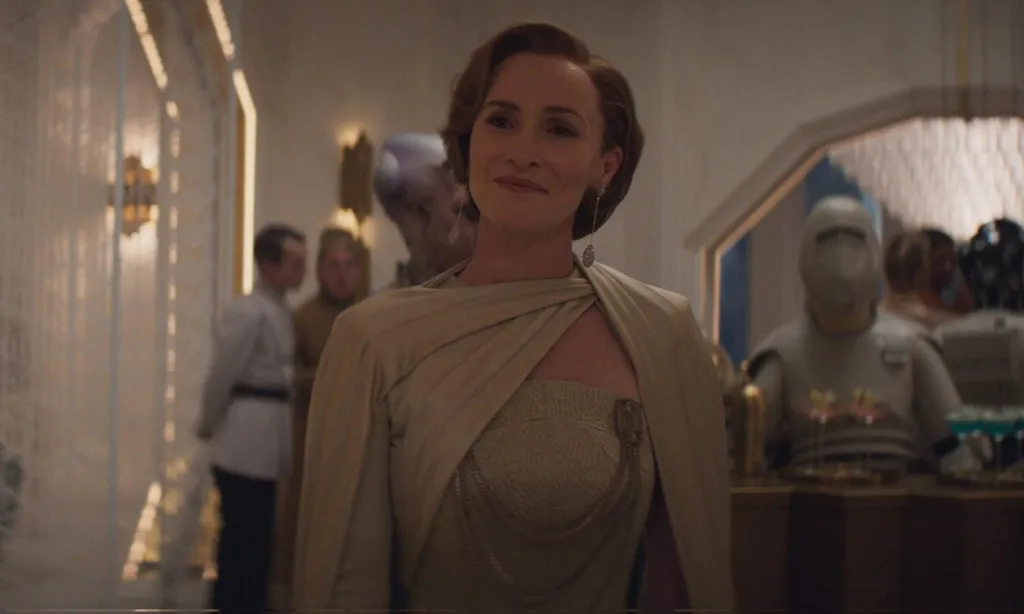 No, Vice Admiral Holdo (Laura Dern) wasn’t the greatest one-and-done Rebel/Resistance character we’ve had. Does wearing a gorgeous gown make any sense when everyone else is in uniforms and fatigues? I don’t know, maybe it does on her home planet (Gatalenta, by the by). As we learned with Mon Mothma by now on Andor, there are quite a few cultures in Star Wars who like their clothes, beyond the entire planet of Naboo.