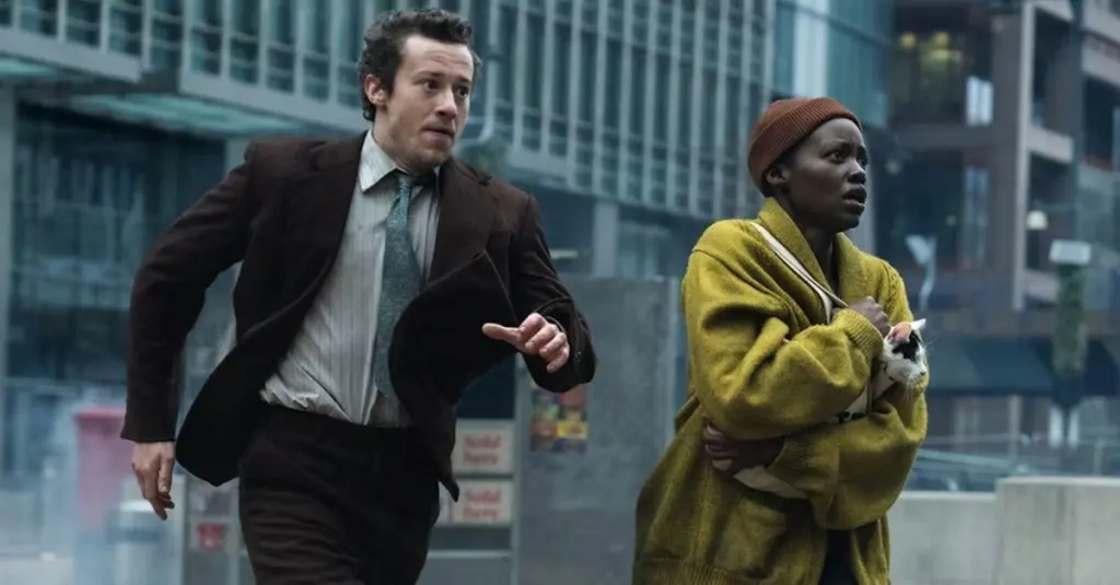 Joseph Quinn and Lupita Nyong'o run from audibly-enhanced aliens.