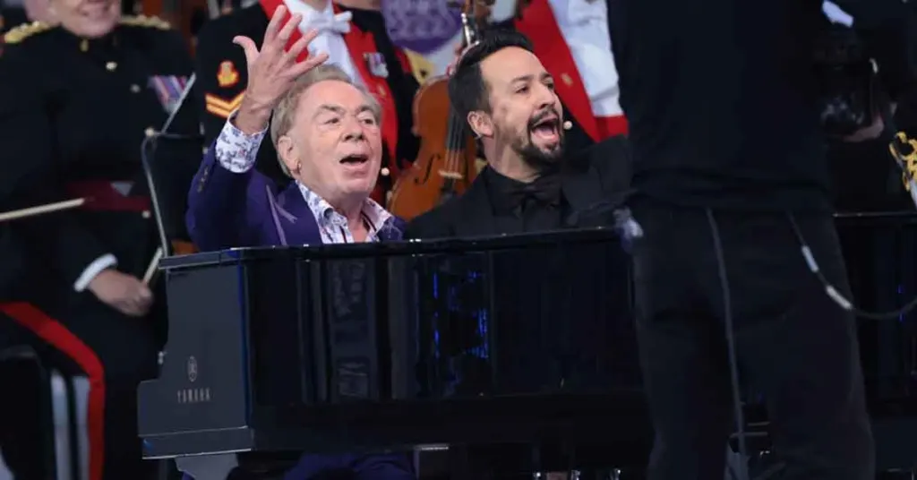 LONDON, ENGLAND – JUNE 04: Andrew Lloyd Webber (left) and Lin-Manuel Miranda perform at the BBC Platinum Party at the Palace, as part of the Queen's Platinum Jubilee celebrations, on June 4, 2022 in London, England. The Platinum Jubilee of Elizabeth II is being celebrated from June 2 to June 5, 2022, in the UK and Commonwealth to mark the 70th anniversary of the accession of Queen Elizabeth II on 6 February 1952. (Photo by Humphrey Nemar – WPA Pool/Getty Images)