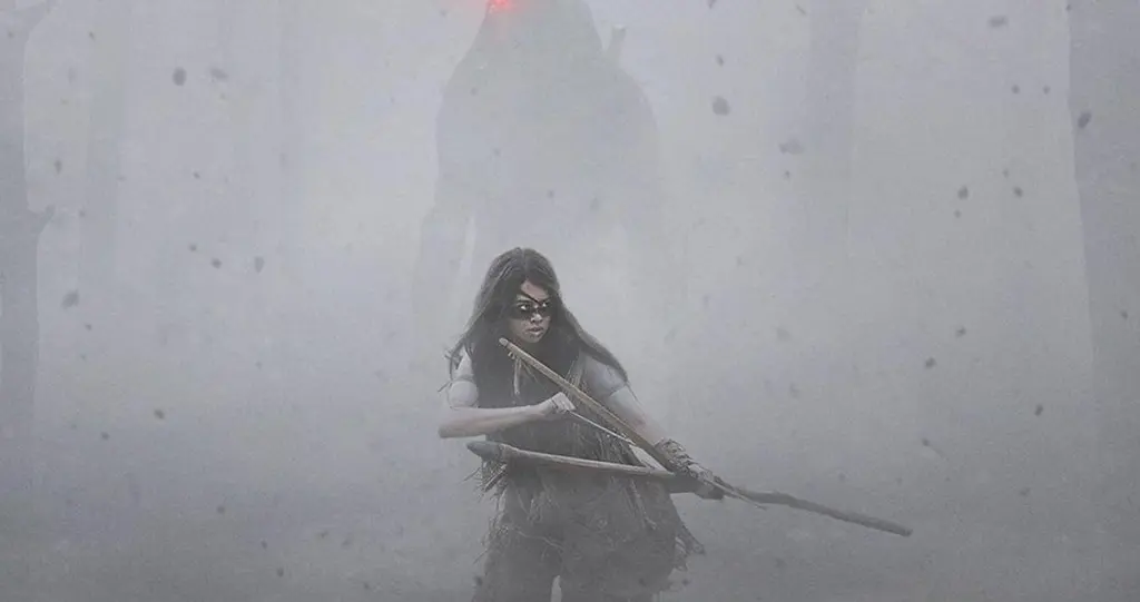 Naru (Amber Midthunder) and the Predator (Dane DiLiegro), shown. (Photo by David Bukach.)