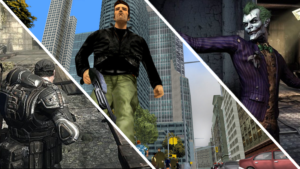 Screenshots from Gears of War, Grand Theft Auto III, and Batman: Arkham Asylum.