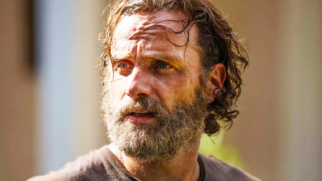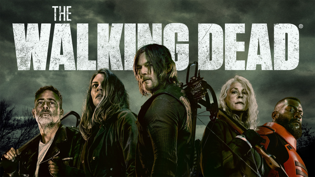 Five characters from The Walking Dead television series standing together with the show's logo emblazoned behind them.