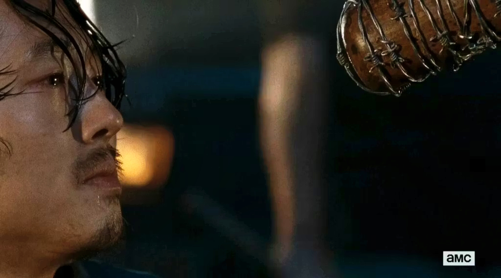 Ten years ago, in October of 2016, The Walking Dead aired its Season 7 premiere, “The Day Will Come When You Won’t Be”. It was one of the most highly-anticipated events in television, as the Season 6 finale teased a brutal death of a main character, at the hands of Negan (Morgan), the authoritative leader of a group called the Saviors. The Season 7 premiere faked viewers (and the cast) out by actually killing off two characters – the most brutal being the death of Yeun’s character, Glenn, who was a fan-favorite and largely viewed as the heart and soul of the survivor group. Negan bashed Glenn’s head in with his baseball bat, “Lucille,” so hard that Glenn’s left eye was popping out of its socket, as the doomed boy tried to sputter out one last farewell to his love, Maggie (Lauren Cohan).
