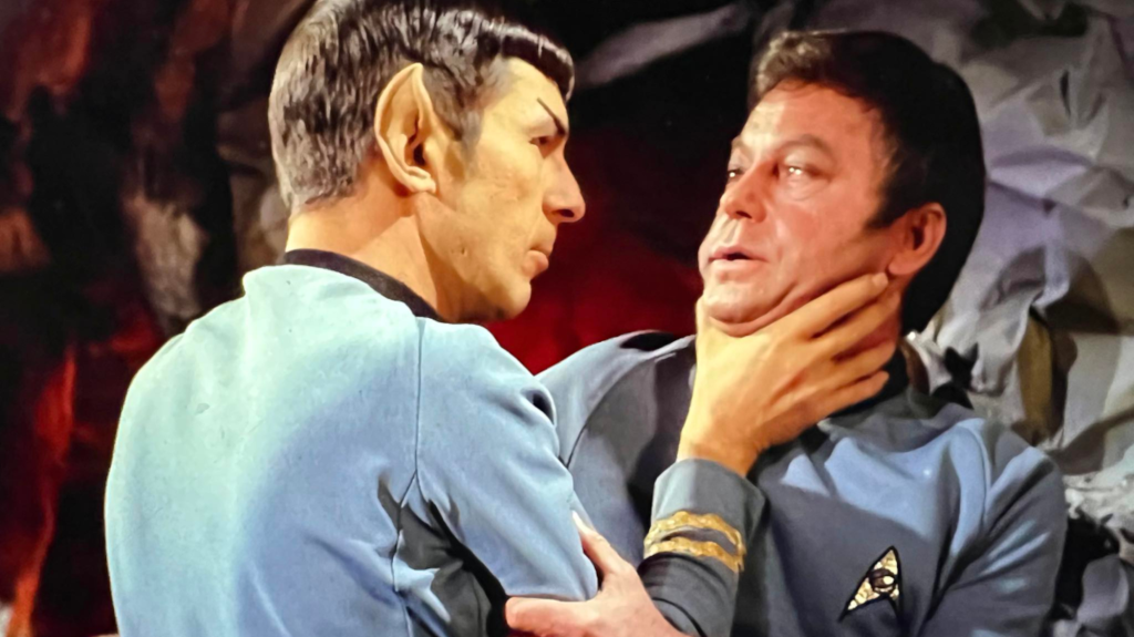 Kirk manages to fight his way back to the present, but finds Atoz and his androids opposing him. Meanwhile, Spock and McCoy have an arc where Spock meets a woman named Zarabeth (Mariette Hartley) who was exiled to the Ice Age past because her family tried to assassinate one of Sarpeidon’s despot rulers. Spock and Zarabeth quickly fall in love, but she conceals the true dangers of time travel, including the side-effect that Spock starts to become attuned with the Vulcan species of that time: a volatile and barbaric people who had not yet mastered their signature logic-over-emotion lifestyle.
