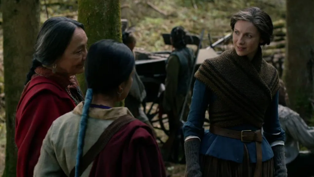 This happens shortly after the first, more peaceful contact between the Frasers and the Cherokee. The atmosphere is still tense, but there’s an attempt at coexistence. At a certain point, the tribe’s healer, Adawehi (Tantoo Cardinal), approaches Claire. Before any extended conversation even begins, she reveals that she already knew who Claire was because she had dreamed about her. Since she doesn’t speak English, the communication happens through translation by her grandson’s wife, Giduhwa (Crystle Lightning), and she starts describing what she saw.