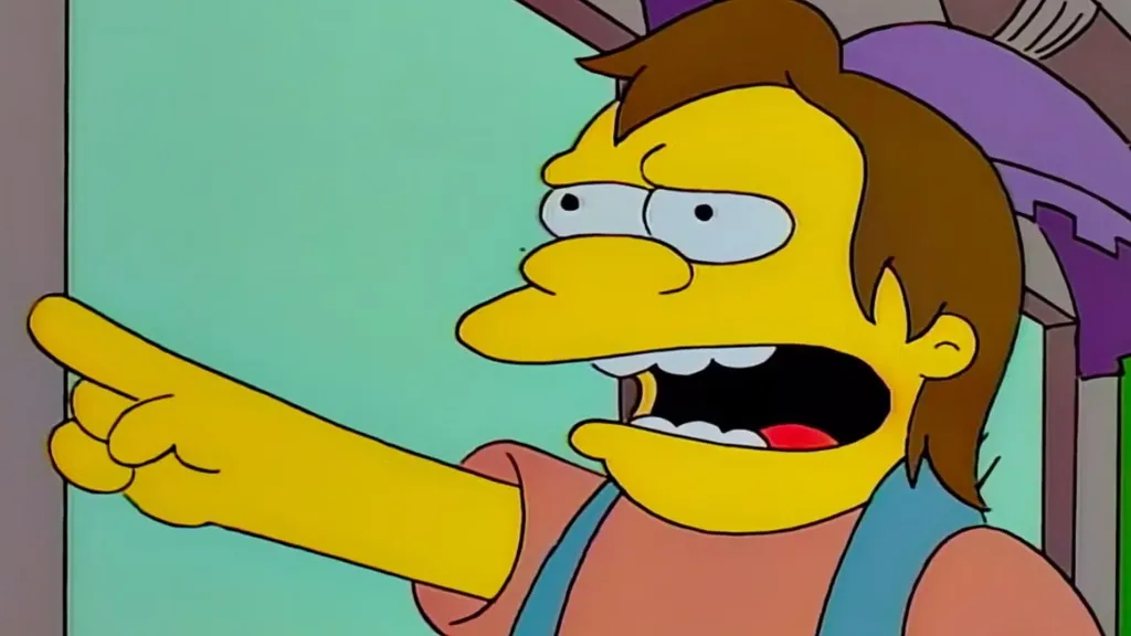 Nelson Muntz is a typical school bully, with him terrorizing Bart and Lisa at Springfield Elementary School. Nelson first appeared in season 1, episode 5, “Bart the General,” where Bart gets the help of his grandpa in order to fight back against the bully.