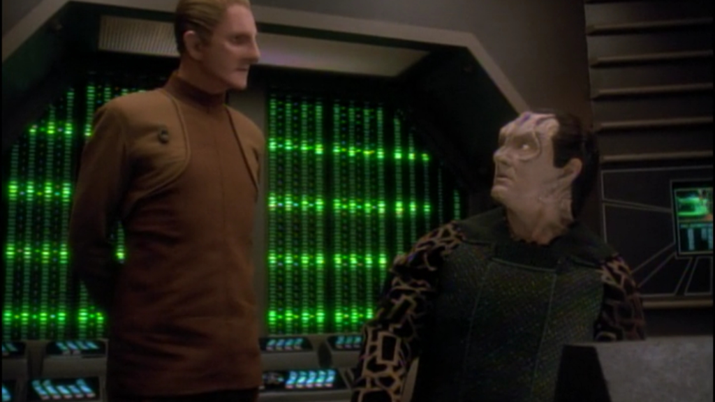 The third and final Season 3 episode Brooks would direct, “Improbable Cause,” features Garak, who survives a bombing in his shop, and launches an investigation into who targeted him. The storyline expands when Odo uncovers a conspiracy involving the Romulan Tal Shiar and Cardassian Obsidian Order. The episode ends on a cliffhanger that leads directly into “The Die Is Cast.” Odo’s interrogation of a Flaxian assassin, Garak’s evasive antics, and the discovery of a joint Cardassian–Romulan fleet preparing for an unauthorized strike. Brooks does a good job directing this dialogue-driven episode, and handles the unravelling of Garak’s past with care.
