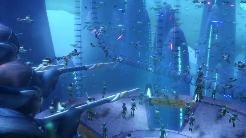 Politics is just as important as the action in The Clone Wars, and Padmรฉ Amidala is constantly wheeling and dealing in the Senate Building. In one abandoned arc, Padmรฉ leaves her cushy post on Coruscant to visit Mon Cala and plead with the leaders there to help her get Chancellor Palpatine out of power. Of course, in typical The Cone Wars fashion, twists and turns occur that put Anakin’s wife in grave danger.