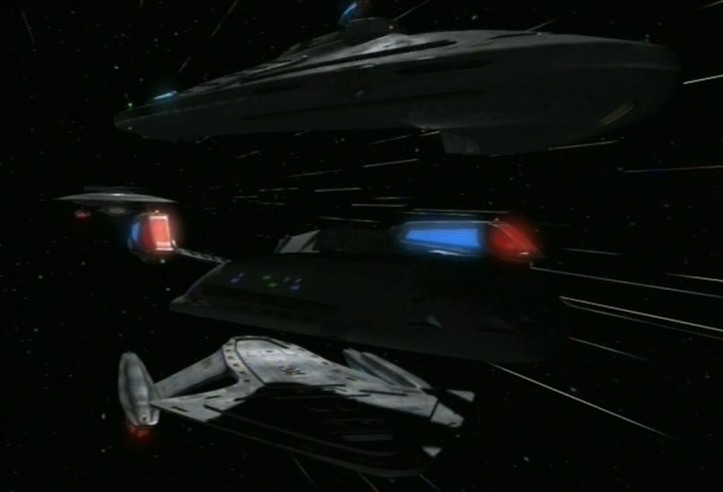 Saucer separations would be mentioned throughout Star Trek: TNG, and used at times in strategic missions, like when Lt. Geordi La Forge (Lavar Burton) took temporary command of the Enterprise and separated the ship to fight an entire planetary weapons system (“Arsenal of Freedom”). One of the most famous examples of the Enterprise splitting in two halves was when the ship used it as a tactical move to distract and fight the Borg Cube vessel. The Enterprise crew feigned an all-out assault on the Borg while staging a high-stakes rescue of Captain Picard, who had been assimilated into the Borg collective as “Locutus” in the classic two-part finale to Season 3, “The Best of Both Worlds”.