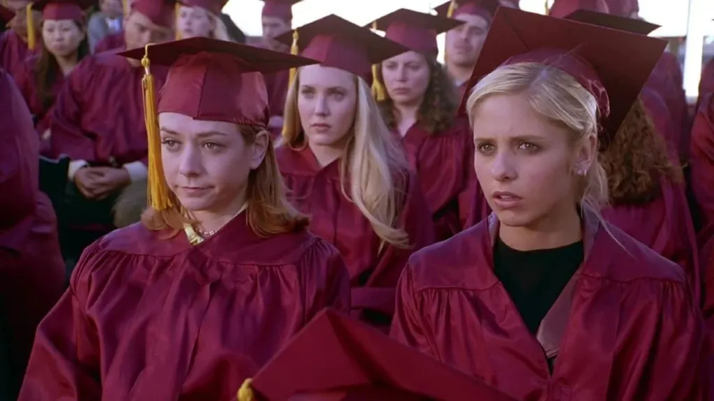This finale also solidifies the character’s emotional growth while setting the stage for the challenges to come, but itโs the quieter moments that make it memorable as we watch the Scoobies bittersweet farewell to their high school years and the realization that life as they knew it will never be the same.