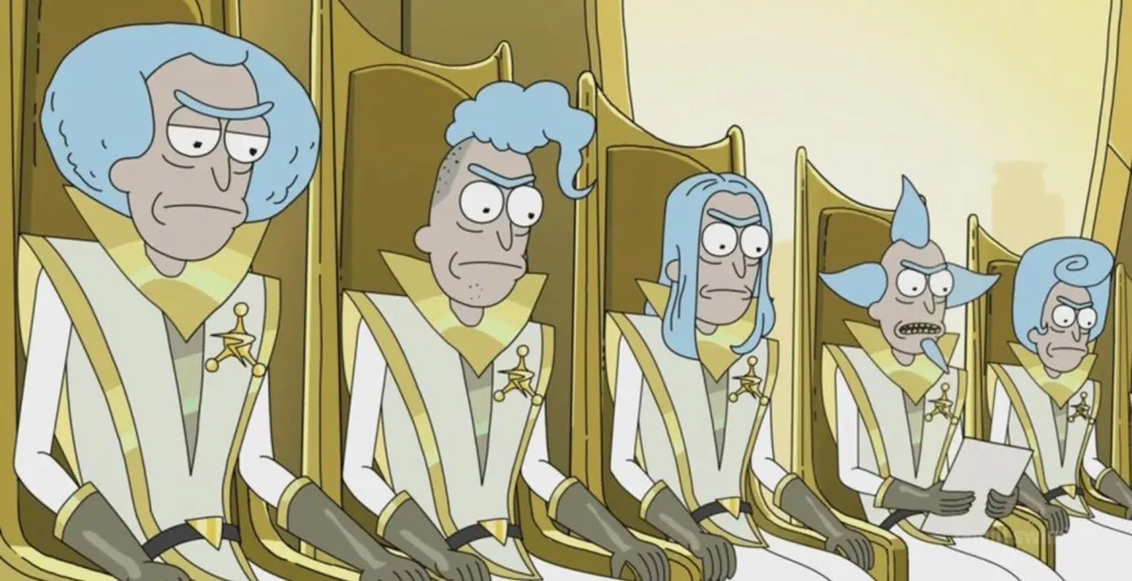 Starting from the beginning, Rick and Morty introduced the multi-dimensional nexus the “Citadel of Ricks” in Season 1, Episode 10, “Close Rick-counters of the Rick Kind,” and it was there we first met the “Council of Ricks.” These cartoonishly villainous variants were definitely based on Marvel Comics’ “Council of Reeds” to start, but it didn’t take long for them to be downplayed in the series. Still, the show took plenty of time to crack jokes about this concept, my personal favorite being a line from Summer (Spencer Grammer) in the season 3 premiere — “My grandpa was my hero. You killed him because you were jealous of him, that’s pretty obvious from the haircuts.”