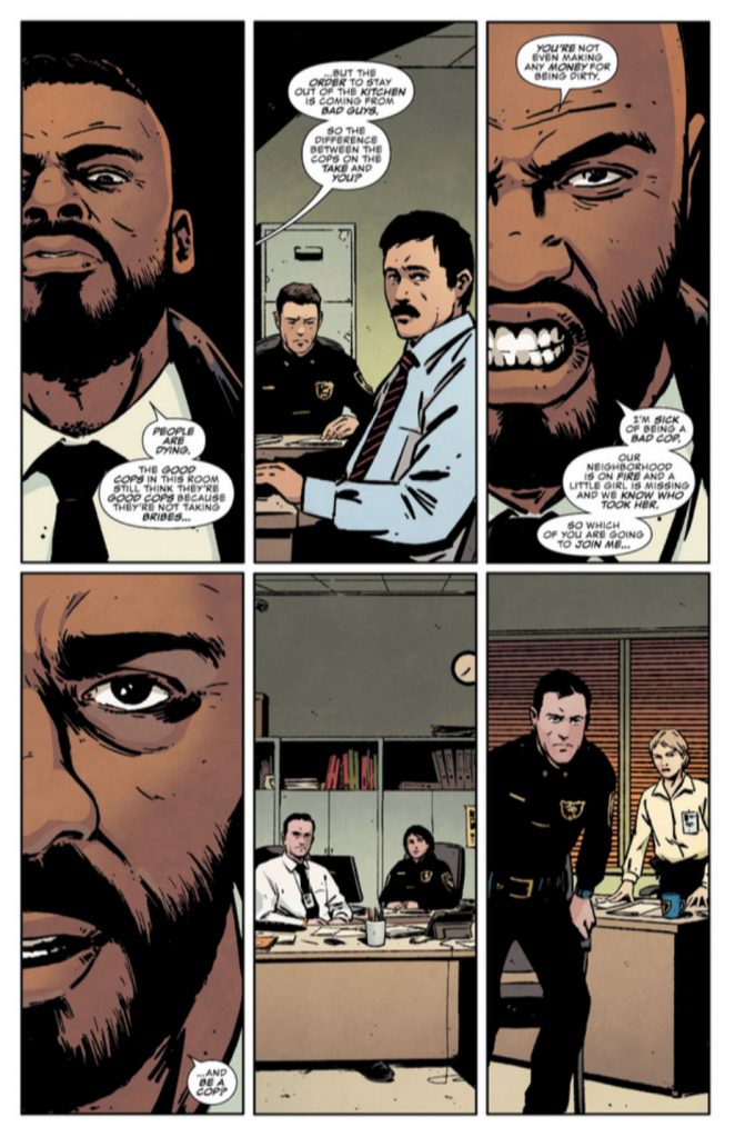 2019’s Daredevil #1 establishes that Cole, who transferred from Chicago to New York’s 18th Precinct, has a clean-cut, by-the-books attitude that clashes with the local officers.