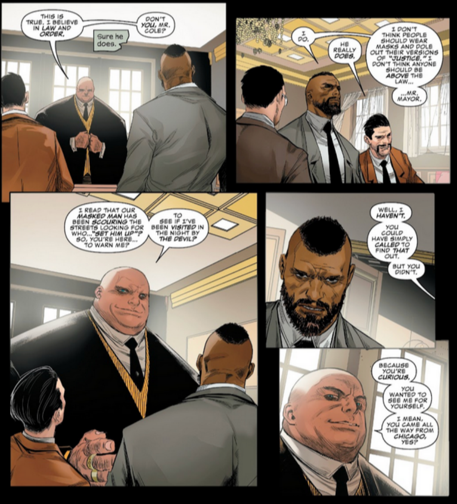 “I don’t think people should wear masks and dole out their versions of ‘justice,’” Cole tells Fisk in the mayor’s office. “I don’t think anyone should be above the law… Mr. Mayor.”