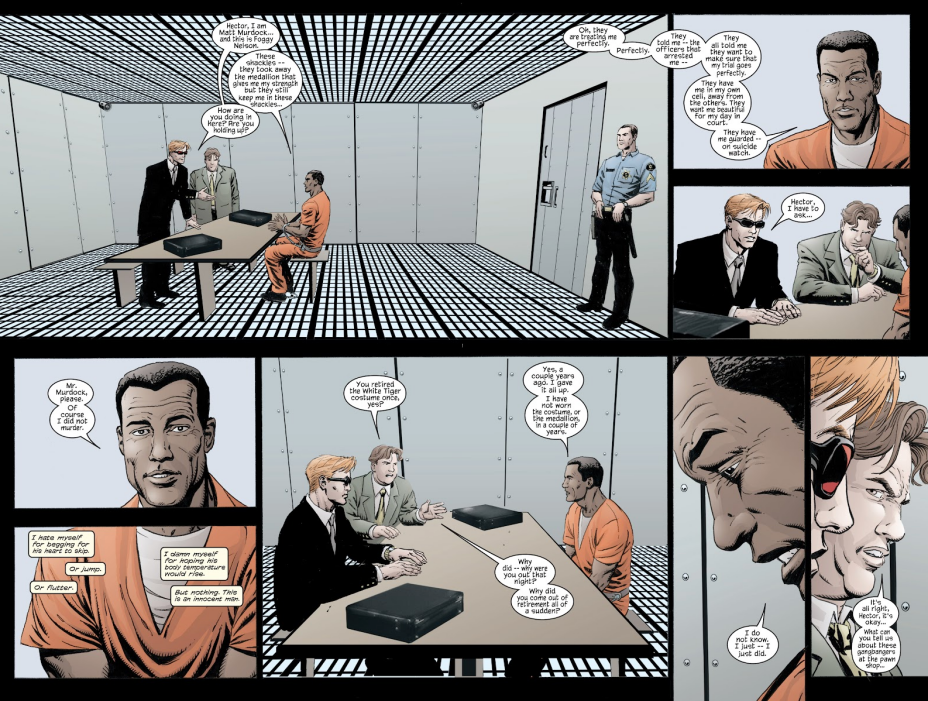 Matt and his associate, Foggy Nelson, met with Hector at Ryker’s Island, where Matt’s heightened senses detected no lies as Hector claimed innocence. Meanwhile, Luke and Danny tracked down the gang members responsible for the cop killing, while Matt and Foggy had members of the superhero community testify on Hector’s behalf when the Trial of the White Tiger took place in Daredevil #39-#40.