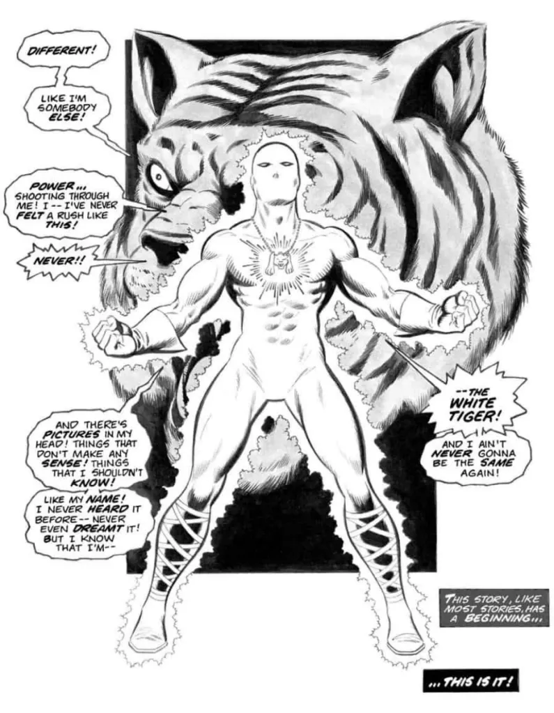 The mystical tiger-shaped amulets grant their wearer enhanced strength, speed, durability, stamina, agility, and reflexes. In Deadly Hands of Kung Fu #19’s Sons of the Tiger backup story (by writers Bill Mantlo and Yvette O. Perez and artists George Perez and Jack Abel), titled “An Ending,” the trio disbanded and discarded their amulets. It was the beginning for Hector Ayala, the then-unnamed young man who found the amulets and was immediately transformed into a martial arts master: the White Tiger.