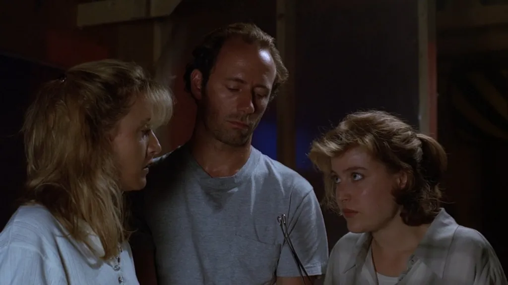 From there, the episode takes a series of harrowing twists and turns as the seeds of paranoia are sown. Like we see in The Thing, the characters in “Ice” quickly realize that everyone among them is a potential threat. Mulder even falls under suspicion, ultimately finding himself forcefully quarantined pending further investigation. Fans of The Thing might remember that Dr. Blair(Wilford Brimley) experiences a nearly identical fate when the team locks him in the toolshed after he lands on their collective radar.