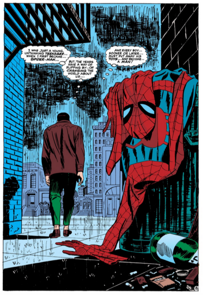 Episode 7 ends with Spider-Man suffering the Scorpion’s sting — he’s nearly killed when he’s impaled by the cybernetic stinger that manages to puncture his Oscorp suit — and Osborn dispatches a prototype glider to rescue the wounded Spider-Man. Episode 8 then opens with a homage to John Romita Sr.’s classic page in 1967’s iconic Amazing Spider-Man #50, which shows a discouraged Peter Parker trashing his Spider-Man costume in a story titled “Spider-Man No More.” (Peter resumes his crime-fighting career on the final page of that same issue.)