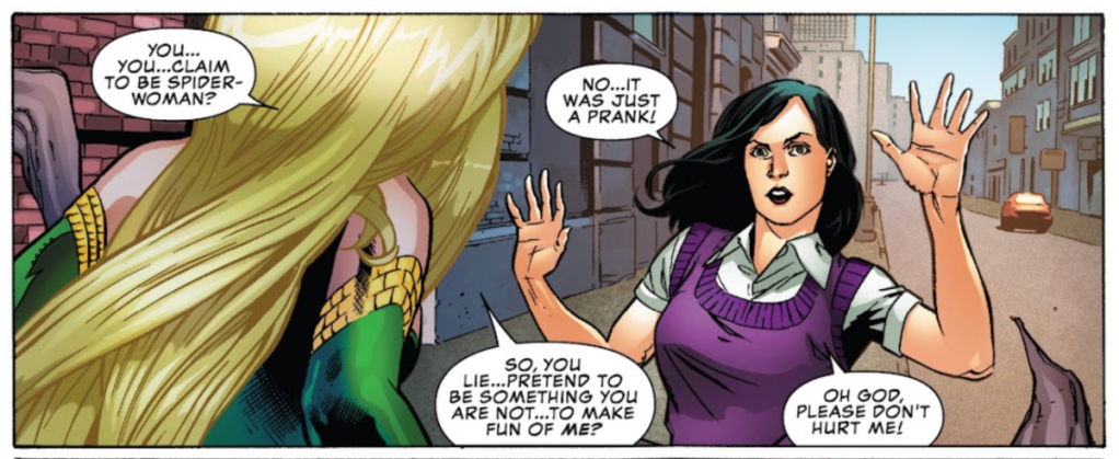 Diane Jenkins appeared only once in the pages of 2019’s Marvel Comics Presents #8. A college student at ESU, Diane “unmasked” herself as Spider-Woman in a 15-second viral video. Jessica Drew, the real arachnid avenger, tracked down Diane and saved her from an assassination attempt by Hydra: the terrorist organization that once tricked the Spider-Woman into working as their assassin “Arachne.” When Charlotte Winter — an evil, multi-limbed Spider-Woman — attacked Diane, she fled into the street and was killed by a bus. In the end, Diane’s death was a cautionary tale about the dangers of social media.